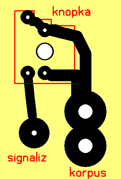 Материал - фольгированный стеклотекстолит толщиной от 1 мм. Размеры платы 36х53 мм. Для крепления к корпусу сверлятся 2 отверстия диаметром по 4 мм. Для крепления кнопки - одно отверстие 5 мм, и 4 по 1 мм. Для провода подключения к сигнализации 1,5 мм. Сигнализация должна срабатывать при включении кнопки, т.е. замыкание входа на корпус автомобиля. Отзывы, вопросы, предложения пишите здесь. или на почту. Последнее обновление: 16.04.2006.